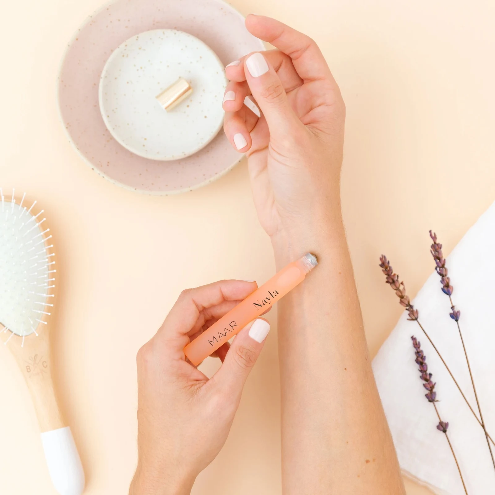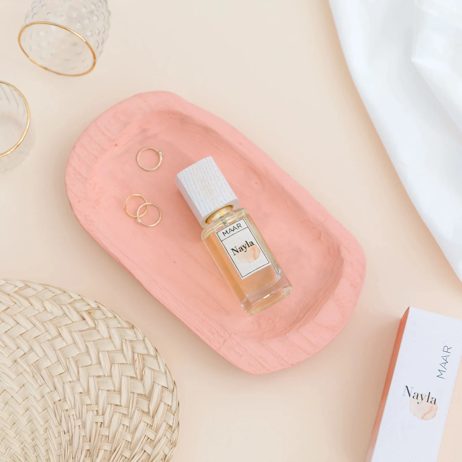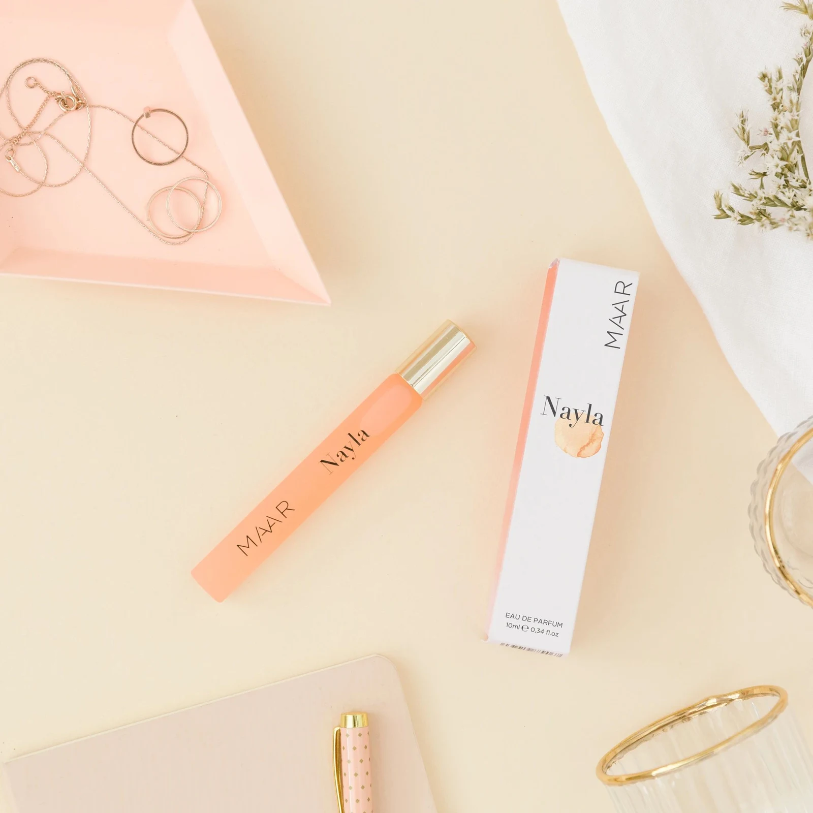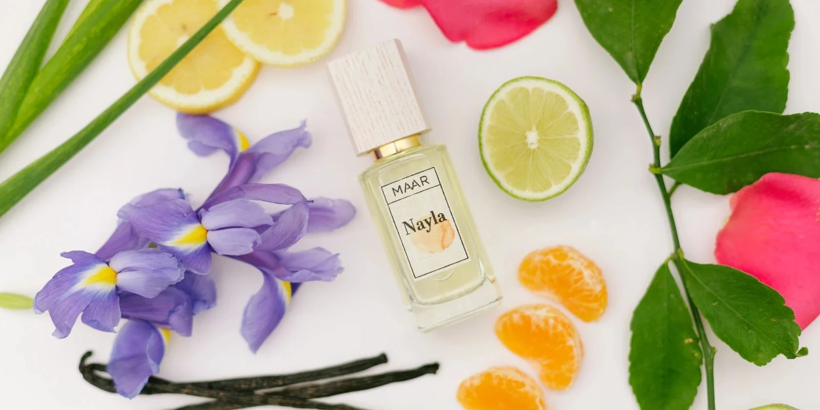 Nayla de Maar est une fragrance florale pour femme. Lancée en 2020, cette composition se compose d'une tête de citron, pamplemousse, mandarine et bergamote ; d'un cœur de neroli et fleur d'oranger ; et d'un fond d'iris, rose et vanille.