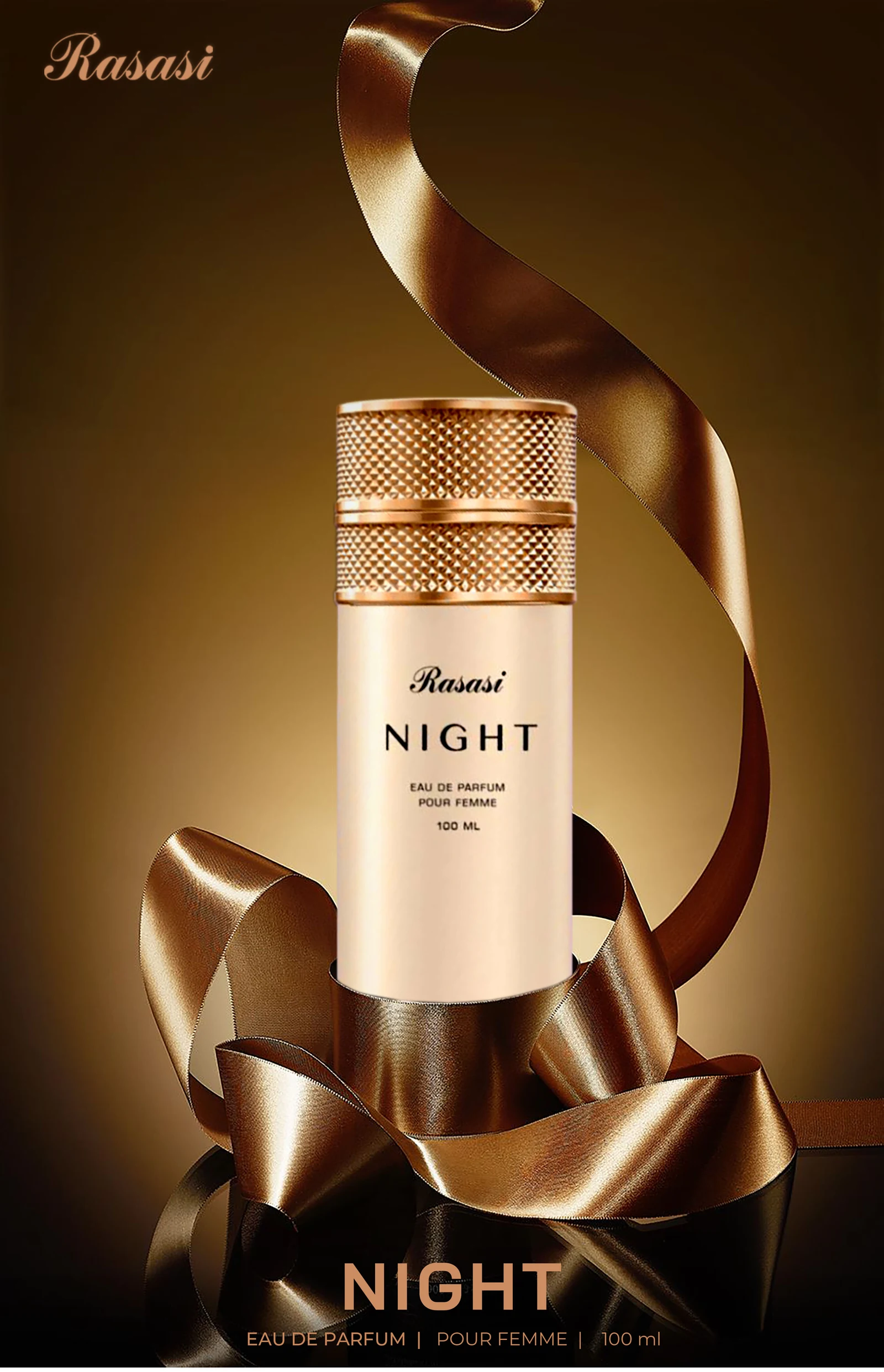 Night de Rasasi est une fragrance de la famille olfactive fleur boisée musquée pour femme. Lancée en 2023, cette composition dévoile en ses notes de tête la fleur d'oranger, la bergamote, le magnolia et l'amande. Le cœur révèle un bouquet floral composé de patchouli, jasmin, mimosa, rose et iris. La base s'assied sur la haricot tonka, le patchouli, la vanille, le vétiver, la davana, le sucre et la muscade, signée par le parfumeur responsable de sa création.