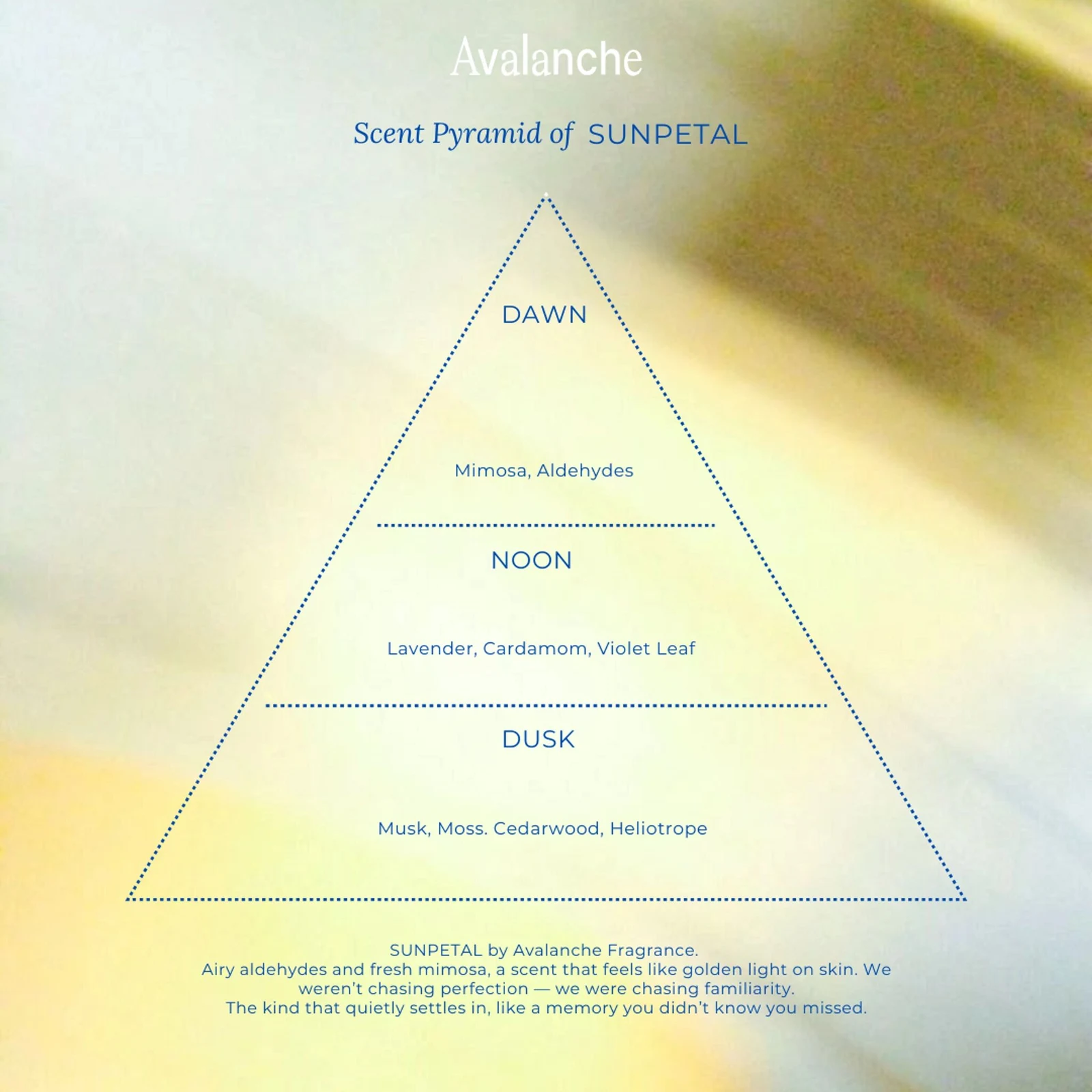 Sunpetal d'Avalanche Fragrance est une création de 2025 appartenant à la famille olfactive fleurie musquée boisée, conçue pour hommes et femmes. Cette nouvelle fragrance déploie une pyramide olfative où les notes de tête sont des aldéhydes et la mimosa ; le cœur est composé de lavande, feuilles de violette et cardamome ; et le fond révèle l'héliotrope, la musc, le cèdre et le mousse.